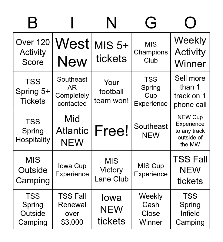This bingo card has a free space and 24 words: Iowa Cup Experience, TSS Fall Renewal over $3,000, Your football team won!, TSS Spring Outside Camping, Weekly Activity Winner, Over 120 Activity Score, TSS Spring 5+ Tickets, West New, Southeast NEW, MIS Victory Lane Club, TSS Spring Cup Experience, TSS Spring Hospitality, MIS Cup Experience, TSS Fall NEW tickets, Southeast AR Completely contacted, Weekly Cash Close Winner, NEW Cup Experience to any track outside of the MW, MIS 5+ tickets, Sell more than 1 track on 1 phone call, Mid Atlantic NEW, TSS Spring Infield Camping, MIS Outside Camping, MIS Champions Club and Iowa NEW tickets.