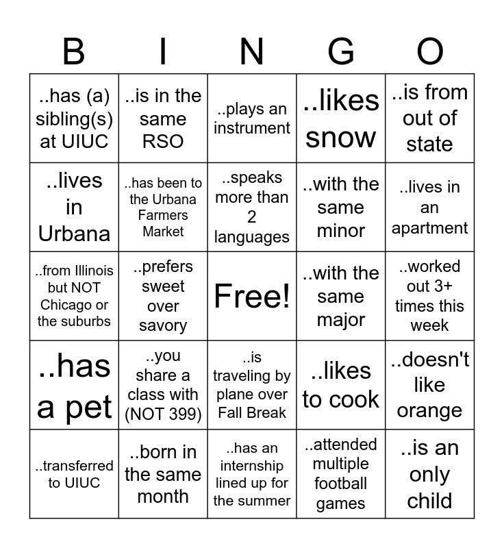 This bingo card has a free space and 24 words: ..you share a class with (NOT 399), ..born in the same month, ..speaks more than 2 languages, ..transferred to UIUC, ..is from out of state, ..has (a) sibling(s) at UIUC, ..lives in Urbana, ..is in the same RSO, ..with the same major, ..is traveling by plane over Fall Break, ..with the same minor, ..from Illinois but NOT Chicago or the suburbs, ..likes to cook, ..doesn't like orange, ..has been to the Urbana Farmers Market, ..attended multiple football games, ..worked out 3+ times this week, ..plays an instrument, ..lives in an apartment, ..prefers sweet over savory, ..is an only child, ..has a pet, ..likes snow and ..has an internship lined up for the summer.