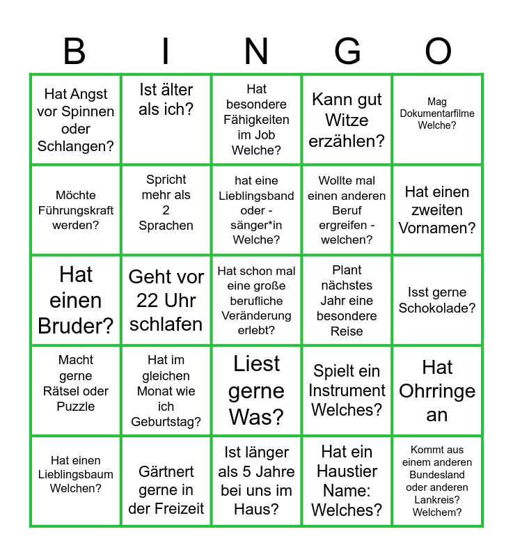This bingo card has a free space and 34 words: Kann eine außergewöhnliche Geschichte aus dem Wald erzählen?, Hat ein Haustier Name: Welches?, Macht morgens Sport Welche?, Ist eine Hobbyköchin Lieblingsgericht?, Macht gerne Rätsel oder Puzzle, Spricht mehr als 2 Sprachen, Mag Dokumentarfilme Welche?, Hat einen Lieblingsbaum Welchen?, Ist älter als ich?, Hat schon mal ein Möbelstück selbst gebaut, hat eine Lieblingsband oder -sänger*in Welche?, Hat besondere Fähigkeiten im Job Welche?, Hat die gleiche Schuhgröße wie ich?, Hat die Lieblingsfarbe rosa?, Plant nächstes Jahr eine besondere Reise, Hat einen zweiten Vornamen?, Gärtnert gerne in der Freizeit, Hat einen Bruder?, Hat im gleichen Monat wie ich Geburtstag?, Spielt ein Instrument Welches?, Liest gerne Was?, Hat die gleiche Sockenfarbe wie ich?, Hat Angst vor Spinnen oder Schlangen?, Isst gerne Schokolade?, Ist länger als 5 Jahre bei uns im Haus?, Kommt aus einem anderen Bundesland oder anderen Lankreis? Welchem?, Kann gut Witze erzählen?, Hat ein Lieblingstier? Welches?, Wollte mal einen anderen Beruf ergreifen - welchen?, Möchte Führungskraft werden?, Trägt Schuhgröße 40, Geht vor 22 Uhr schlafen, Hat Ohrringe an and Würde gerne mit mehr Frauen arbeiten?.