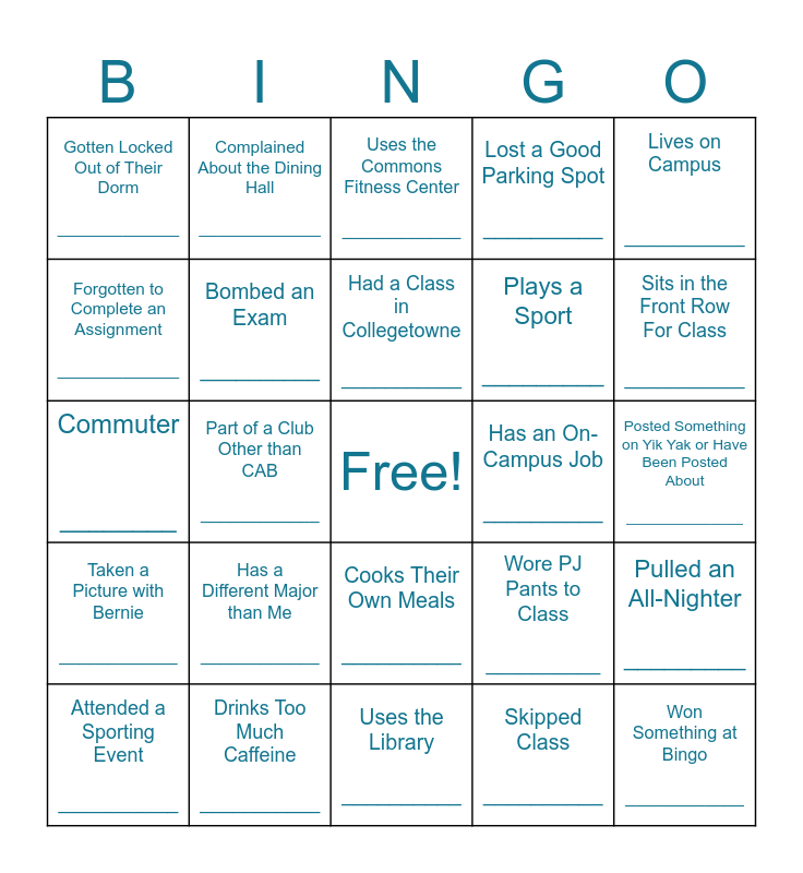 This bingo card has a free space and 24 words: Has a Different Major than Me ____________, Drinks Too Much Caffeine ___________, Had a Class in Collegetowne ___________, Attended a Sporting Event ___________, Lives on Campus ___________, Gotten Locked Out of Their Dorm _____________, Forgotten to Complete an Assignment _____________, Complained About the Dining Hall _____________, Has an On-Campus Job __________, Cooks Their Own Meals __________, Plays a Sport _________, Commuter ________, Wore PJ Pants to Class __________, Pulled an All-Nighter _________, Bombed an Exam __________, Skipped Class __________, Posted Something on Yik Yak or Have Been Posted About ______________, Uses the Commons Fitness Center ____________, Sits in the Front Row For Class ___________, Part of a Club Other than CAB ____________, Won Something at Bingo ____________, Taken a Picture with Bernie ____________, Lost a Good Parking Spot __________ and Uses the Library __________.
