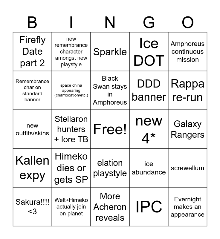 This bingo card has a free space and 24 words: Himeko dies or gets SP, Welt+Himeko actually join on planet, Black Swan stays in Amphoreus, Sakura!!!! <3, Amphoreus continuous mission, Firefly Date part 2, Remembrance char on standard banner, new remembrance character amongst new playstyle, new 4*, elation playstyle, DDD banner, new outfits/skins, ice abundance, screwellum, space china appearing (char/location/etc.), IPC, Galaxy Rangers, Sparkle, Rappa re-run, Stellaron hunters + lore TB, Evernight makes an appearance, Kallen expy, Ice DOT and More Acheron reveals.