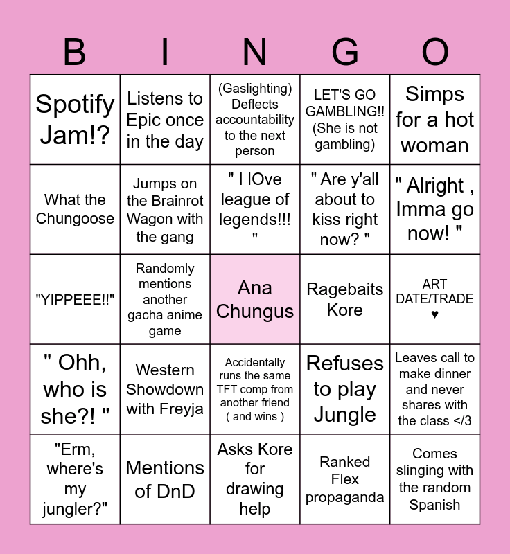 This bingo card has a free space and 24 words: Western Showdown with Freyja, Mentions of DnD, " I lOve league of legends!!! ", "Erm, where's my jungler?", Simps for a hot woman, Spotify Jam!?, What the Chungoose, Listens to Epic once in the day, Ragebaits Kore, Accidentally runs the same TFT comp from another friend ( and wins ), " Are y'all about to kiss right now? ", "YIPPEEE!!", Refuses to play Jungle, Leaves call to make dinner and never shares with the class </3, Jumps on the Brainrot Wagon with the gang, Ranked Flex propaganda, ART DATE/TRADE ♥, (Gaslighting) Deflects accountability to the next person, " Alright , Imma go now! ", Randomly mentions another gacha anime game, Comes slinging with the random Spanish, " Ohh, who is she?! ", LET'S GO GAMBLING!! (She is not gambling) and Asks Kore for drawing help.