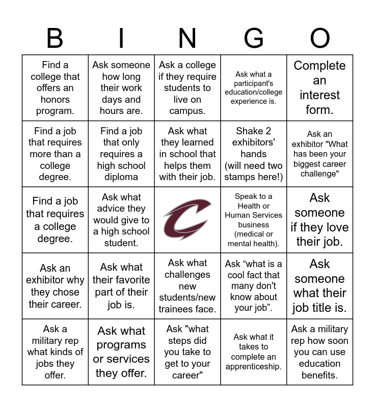 This bingo card has a free space and 27 words: Ask “what is a cool fact that many don't know about your job”., Speak to an apprenticeship., Shake 2 exhibitors' hands (will need two stamps here!), Ask "what steps did you take to get to your career", Find a job that requires more than a college degree., Ask a college if they require students to live on campus., Ask someone how long their work days and hours are., Ask an exhibitor why they chose their career., Speak to a Health or Human Services business (medical or mental health)., Ask someone what their job title is., Find a job that requires a college degree., Ask what a participant's education/college experience is., Ask a military rep what kinds of jobs they offer., Ask what programs or services they offer., Ask an exhibitor "What has been your biggest career challenge", Ask a military rep how a military contract works., Find a job that only requires a high school diploma, Ask what they learned in school that helps them with their job., Ask what their favorite part of their job is., Find a college that offers an honors program., Ask someone if they love their job., Ask what it takes to complete an apprenticeship., Ask what advice they would give to a high school student., Ask a military rep how soon you can use education benefits., Ask what challenges new students/new trainees face., Complete an interest form. and Find an organization that offers internships..