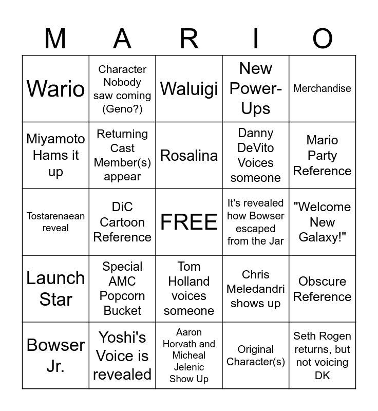 This bingo card has a free space and 24 words: Special AMC Popcorn Bucket, Yoshi's Voice is revealed, Rosalina, Bowser Jr., Merchandise, Wario, Miyamoto Hams it up, Character Nobody saw coming (Geno?), It's revealed how Bowser escaped from the Jar, Tom Holland voices someone, Danny DeVito Voices someone, Tostarenaean reveal, Chris Meledandri shows up, Obscure Reference, Returning Cast Member(s) appear, Original Character(s), "Welcome New Galaxy!", Waluigi, Mario Party Reference, DiC Cartoon Reference, Seth Rogen returns, but not voicing DK, Launch Star, New Power-Ups and Aaron Horvath and Micheal Jelenic Show Up.
