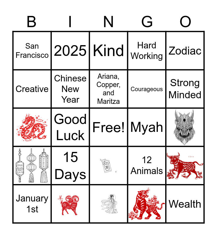 This bingo card has 12 images, a free space and 20 words: Dumplings & Uncut Noodles, Good Luck, Red & Gold, Chinese New Year, Zodiac, 2025, Ariana, Copper, and Maritza, Kind, Charming, Myah, January 1st, 15 Days, 12 Animals, Wealth, Hard Working, Courageous, Creative, San Francisco, Moon Goddess and Strong Minded.