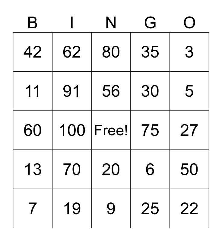 This bingo card has a free space and 49 words: 4, 22, 10, 9, 70, 14, 62, 1, 11, 0, 91, 35, 50, 6, 12, 44, 56, 75, 21, 3, 100, 25, 42, 30, 2, 5, 7, 8, 20, 13, 15, 16, 17, 18, 19, 20, 23, 26, 27, 31, 39, 40, 45, 99, 60, 80, 90, 67 and 95.
