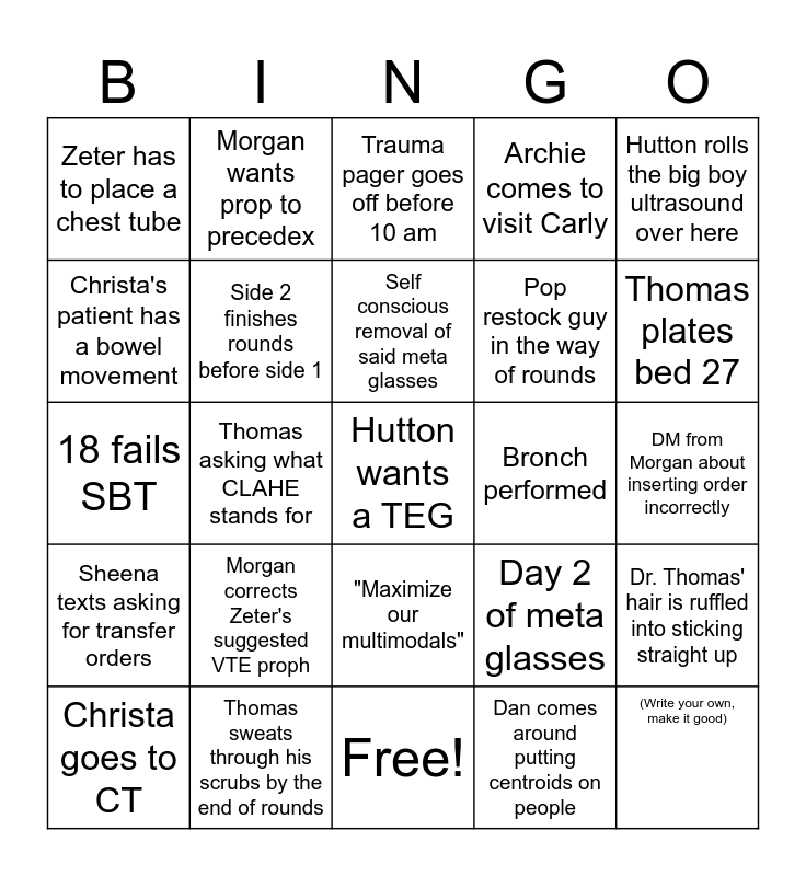 This bingo card has 25 words: Sheena texts asking for transfer orders, Thomas sweats through his scrubs by the end of rounds, Hutton wants a TEG, Dan comes around putting centroids on people, Hutton rolls the big boy ultrasound over here, Zeter has to place a chest tube, Morgan wants prop to precedex, Trauma pager goes off before 10 am, Bronch performed, Dr. Thomas' hair is ruffled into sticking straight up, Christa's patient has a bowel movement, Side 2 finishes rounds before side 1, Free!, Day 2 of meta glasses, Thomas plates bed 27, Christa goes to CT, Thomas asking what CLAHE stands for, Self conscious removal of said meta glasses, Pop restock guy in the way of rounds, DM from Morgan about inserting order incorrectly, 18 fails SBT, Morgan corrects Zeter's suggested VTE proph, "Maximize our multimodals", Archie comes to visit Carly and (Write your own, make it good).