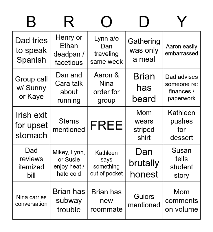 This bingo card has a free space and 26 words: Kathleen says something out of pocket, Guiors mentioned, Aaron & Nina order for group, Brian has subway trouble, Aaron easily embarrassed, Dad tries to speak Spanish, Group call w/ Sunny or Kaye, Henry or Ethan deadpan / facetious, Kathleen pushes for dessert, Dan brutally honest, Brian has beard, Irish exit for upset stomach, Susan tells student story, Nina carries conversation, Sterns mentioned, Nina asks for hot sauce, Gathering was only a meal, Dad reviews itemized bill, Lynn a/o Dan traveling same week, Mom comments on volume, Dad advises someone re: finances / paperwork, Brian has new roommate, Mom wears striped shirt, Mikey, Lynn, or Susie enjoy heat / hate cold, Dan and Cara talk about running and Someone has new glasses.