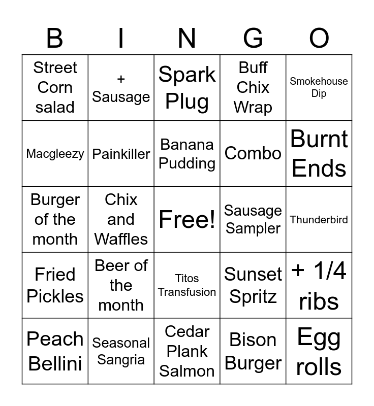 This bingo card has a free space and 29 words: Peach Bellini, Nachos, Chix and Waffles, soup, Street Corn salad, Spark Plug, Painkiller, Beer of the month, Sausage Sampler, Seasonal Sangria, Thunderbird, Egg rolls, Cedar Plank Salmon, Bison Burger, Burnt Ends, Mac Bowl, Titos Transfusion, Fried Pickles, Smokehouse Dip, Burger of the month, Sunset Spritz, Turkey and Cheddar, Combo, Macgleezy, Buff Chix Wrap, + Sausage, + 1/4 ribs, Banana Pudding and Apple Pie Egg rolls.