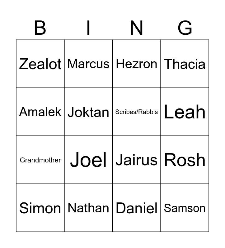 This bingo card has 16 words: Simon, Nathan, Hezron, Thacia, Amalek, Marcus, Jairus, Rosh, Zealot, Joktan, Daniel, Leah, Grandmother, Joel, Scribes/Rabbis and Samson.