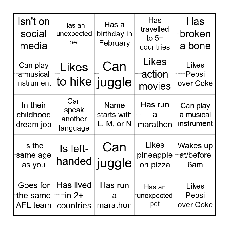 This bingo card has 30 images and 60 words: Has the same number of siblings, Has lived in 2+ countries, Is the youngest sibling, Is the same age as you, Has an unexpected pet, Works in finance, Likes to hike, Can speak another language, Likes action movies, In their childhood dream job, Has travelled to 5+ countries, Is left-handed, Can play a musical instrument, Has ridden a horse, Likes pineapple on pizza, Isn't on social media, Name starts with L, M, or N, Has broken a bone, Doesn't drink coffee, Can juggle, Has run a marathon, Has a birthday in February, Goes for the same AFL team, Wakes up at/before 6am, Plays chess, Likes to cook/bake, Favourite colour is red, Has a similar sense of humour, Likes Pepsi over Coke, Likes spicy food, Has the same number of siblings, Has lived in 2+ countries, Is the youngest sibling, Is the same age as you, Has an unexpected pet, Works in finance, Likes to hike, Can speak another language, Likes action movies, In their childhood dream job, Has travelled to 5+ countries, Is left-handed, Can play a musical instrument, Has ridden a horse, Likes pineapple on pizza, Isn't on social media, Name starts with L, M, or N, Has broken a bone, Doesn't drink coffee, Can juggle, Has run a marathon, Has a birthday in February, Goes for the same AFL team, Wakes up at/before 6am, Plays chess, Likes to cook/bake, Favourite colour is red, Has a similar sense of humour, Likes Pepsi over Coke and Likes spicy food.