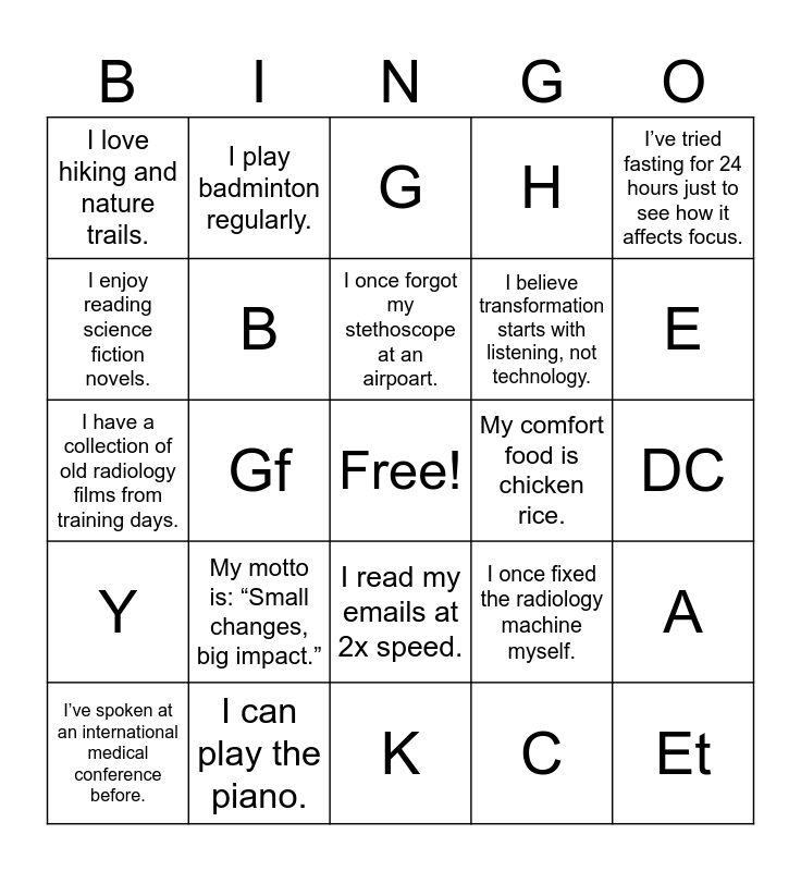 This bingo card has a free space and 24 words: My motto is: “Small changes, big impact.”, I can play the piano., I once forgot my stethoscope at an airpoart., I’ve spoken at an international medical conference before., I’ve tried fasting for 24 hours just to see how it affects focus., I love hiking and nature trails., I enjoy reading science fiction novels., I play badminton regularly., My comfort food is chicken rice., I read my emails at 2x speed., I believe transformation starts with listening, not technology., I have a collection of old radiology films from training days., I once fixed the radiology machine myself., A, B, C, DC, G, E, Gf, Et, Y, H and K.