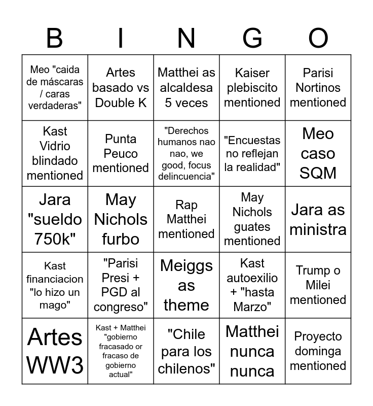 This bingo card has a free space and 24 words: "Parisi Presi + PGD al congreso", Kast + Matthei "gobierno fracasado or fracaso de gobierno actual", "Derechos humanos nao nao, we good, focus delincuencia", Artes WW3, Parisi Nortinos mentioned, Meo "caida de máscaras / caras verdaderas", Kast Vidrio blindado mentioned, Artes basado vs Double K, May Nichols guates mentioned, Meiggs as theme, "Encuestas no reflejan la realidad", Jara "sueldo 750k", Kast autoexilio + "hasta Marzo", Trump o Milei mentioned, Punta Peuco mentioned, Matthei nunca nunca, Jara as ministra, Matthei as alcaldesa 5 veces, Meo caso SQM, May Nichols furbo, Proyecto dominga mentioned, Kast financiacion "lo hizo un mago", Kaiser plebiscito mentioned and "Chile para los chilenos".