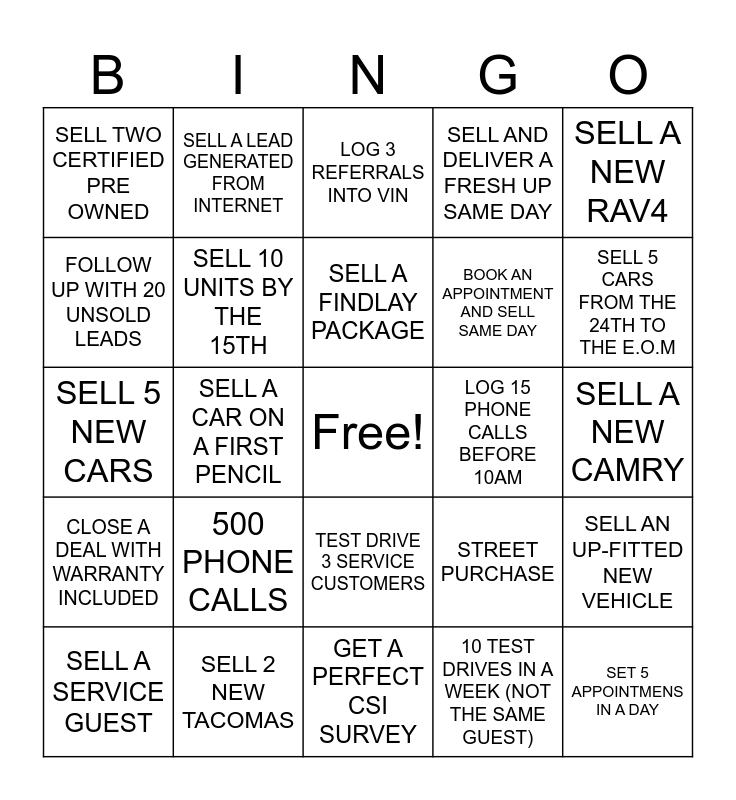 This bingo card has a free space and 24 words: 500 PHONE CALLS, SELL 2 NEW TACOMAS, SELL A FINDLAY PACKAGE, SELL A SERVICE GUEST, SELL A NEW RAV4, SELL TWO CERTIFIED PRE OWNED, FOLLOW UP WITH 20 UNSOLD LEADS, SELL A LEAD GENERATED FROM INTERNET, LOG 15 PHONE CALLS BEFORE 10AM, TEST DRIVE 3 SERVICE CUSTOMERS, BOOK AN APPOINTMENT AND SELL SAME DAY, SELL 5 NEW CARS, STREET PURCHASE, SELL AN UP-FITTED NEW VEHICLE, SELL 10 UNITS BY THE 15TH, 10 TEST DRIVES IN A WEEK (NOT THE SAME GUEST), SELL A NEW CAMRY, LOG 3 REFERRALS INTO VIN, SELL 5 CARS FROM THE 24TH TO THE E.O.M, SELL A CAR ON A FIRST PENCIL, SET 5 APPOINTMENS IN A DAY, CLOSE A DEAL WITH WARRANTY INCLUDED, SELL AND DELIVER A FRESH UP SAME DAY and GET A PERFECT CSI SURVEY.