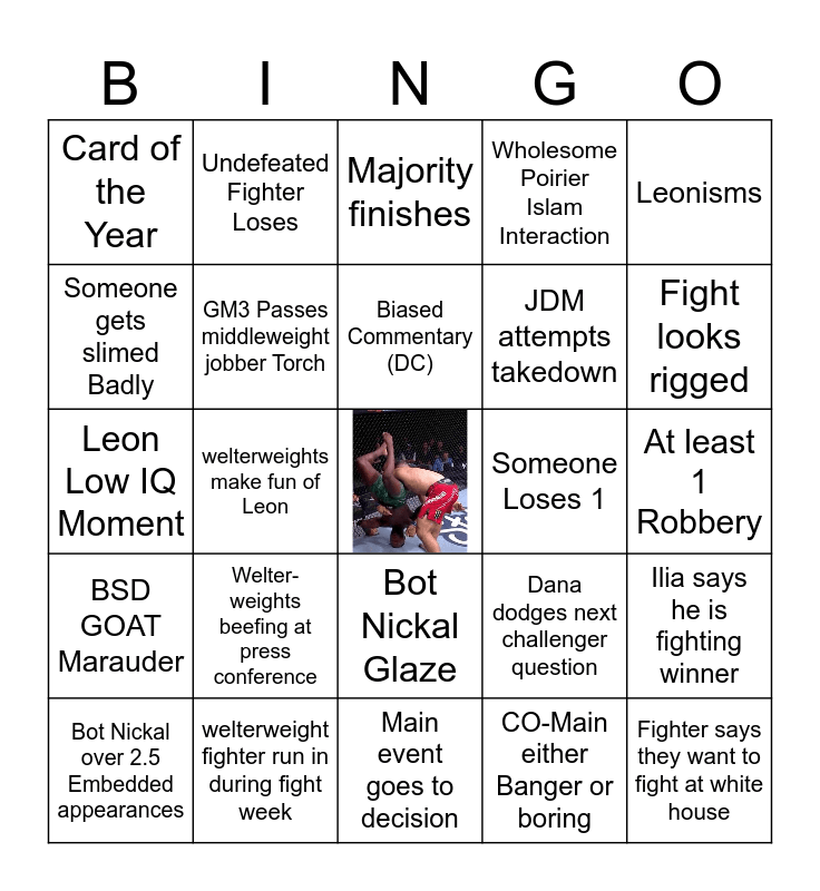 This bingo card has a free space and 24 words: Welter-weights beefing at press conference, welterweight fighter run in during fight week, Biased Commentary (DC), Bot Nickal over 2.5 Embedded appearances, Leonisms, Card of the Year, Someone gets slimed Badly, Undefeated Fighter Loses, Someone Loses 1, Bot Nickal Glaze, JDM attempts takedown, Leon Low IQ Moment, Dana dodges next challenger question, Ilia says he is fighting winner, GM3 Passes middleweight jobber Torch, CO-Main either Banger or boring, At least 1 Robbery, Majority finishes, Fight looks rigged, welterweights make fun of Leon, Fighter says they want to fight at white house, BSD GOAT Marauder, Wholesome Poirier Islam Interaction and Main event goes to decision.