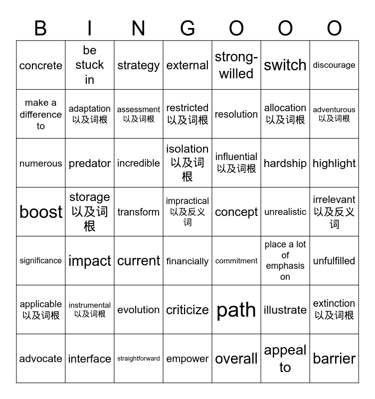 This bingo card has 52 words: interface, allocation以及词根, capable, storage以及词根, incredible, place a lot of emphasis on, be stuck in, appeal to, switch, unfulfilled, discourage, financially, hardship, influential以及词根, path, current, make a difference to, adventurous以及词根, straightforward, strong-willed, resolution, transform, concrete, adaptation以及词根, empower, impractical以及反义词, irrelevant以及反义词, overall, assessment以及词根, unrealistic, emphasize, external, criticize, illustrate, significance, strategy, boost, commitment, applicable以及词根, instrumental以及词根, evolution, numerous, predator, barrier, isolation以及词根, concept, impact, restricted以及词根, extinction以及词根, advocate, highlight and opponent.