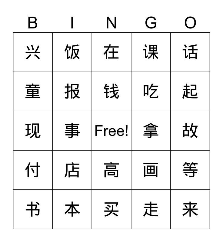 This bingo card has a free space and 24 words: 店, 本, 钱, 书, 话, 兴, 童, 饭, 拿, 高, 吃, 现, 画, 等, 报, 走, 故, 在, 起, 事, 来, 付, 课 and 买.