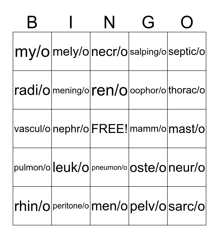This bingo card has a free space and 24 words: leuk/o, peritone/o, ren/o, rhin/o, septic/o, my/o, radi/o, mely/o, mamm/o, pneumon/o, oophor/o, vascul/o, oste/o, neur/o, mening/o, pelv/o, mast/o, necr/o, thorac/o, nephr/o, sarc/o, pulmon/o, salping/o and men/o.