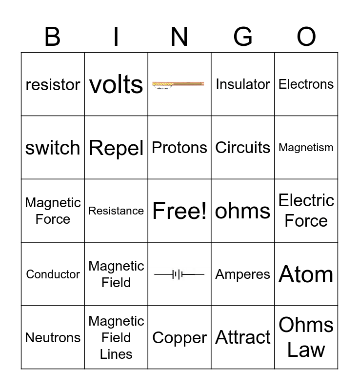 This bingo card has 2 images, a free space and 22 words: Magnetic Field, Magnetic Field Lines, Protons, Neutrons, Electrons, resistor, switch, volts, ohms, Circuits, Magnetic Force, Amperes, Atom, Repel, Attract, Electric Force, Magnetism, Resistance, Ohms Law, Conductor, Insulator and Copper.