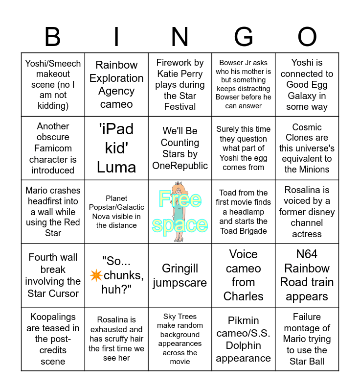 This bingo card has a free space and 24 words: "So... ✴️chunks, huh?", Rosalina is exhausted and has scruffy hair the first time we see her, We'll Be Counting Stars by OneRepublic, Koopalings are teased in the post-credits scene, Yoshi is connected to Good Egg Galaxy in some way, Yoshi/Smeech makeout scene (no I am not kidding), Another obscure Famicom character is introduced, Rainbow Exploration Agency cameo, Toad from the first movie finds a headlamp and starts the Toad Brigade, Gringill jumpscare, Surely this time they question what part of Yoshi the egg comes from, Mario crashes headfirst into a wall while using the Red Star, Voice cameo from Charles, N64 Rainbow Road train appears, 'iPad kid' Luma, Pikmin cameo/S.S. Dolphin appearance, Rosalina is voiced by a former disney channel actress, Firework by Katie Perry plays during the Star Festival, Cosmic Clones are this universe's equivalent to the Minions, Planet Popstar/Galactic Nova visible in the distance, Failure montage of Mario trying to use the Star Ball, Fourth wall break involving the Star Cursor, Bowser Jr asks who his mother is but something keeps distracting Bowser before he can answer and Sky Trees make random background appearances across the movie.