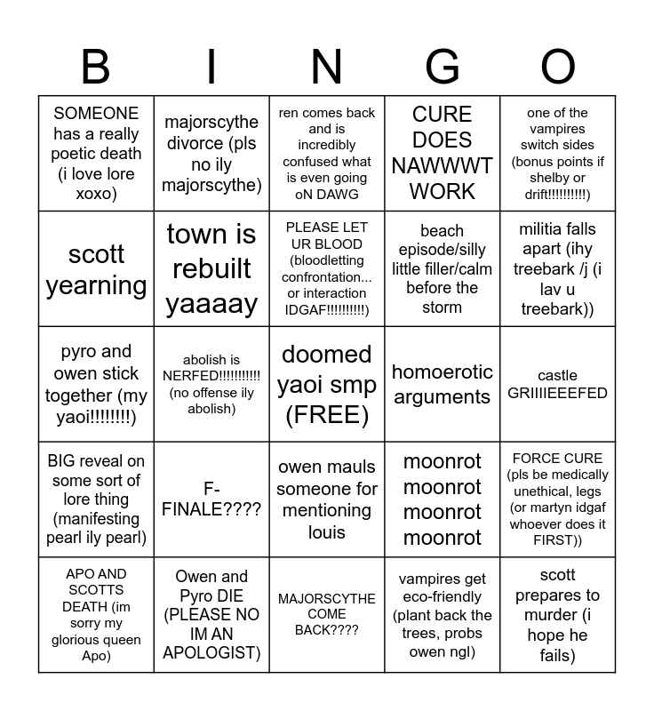 This bingo card has a free space and 24 words: F-FINALE????, Owen and Pyro DIE (PLEASE NO IM AN APOLOGIST), PLEASE LET UR BLOOD (bloodletting confrontation... or interaction IDGAF!!!!!!!!!!), APO AND SCOTTS DEATH (im sorry my glorious queen Apo), one of the vampires switch sides (bonus points if shelby or drift!!!!!!!!!!), SOMEONE has a really poetic death (i love lore xoxo), scott yearning, majorscythe divorce (pls no ily majorscythe), homoerotic arguments, owen mauls someone for mentioning louis, beach episode/silly little filler/calm before the storm, pyro and owen stick together (my yaoi!!!!!!!!), moonrot moonrot moonrot moonrot, FORCE CURE (pls be medically unethical, legs (or martyn idgaf whoever does it FIRST)), town is rebuilt yaaaay, vampires get eco-friendly (plant back the trees, probs owen ngl), castle GRIIIIEEEFED, ren comes back and is incredibly confused what is even going oN DAWG, militia falls apart (ihy treebark /j (i lav u treebark)), abolish is NERFED!!!!!!!!!!! (no offense ily abolish), scott prepares to murder (i hope he fails), BIG reveal on some sort of lore thing (manifesting pearl ily pearl), CURE DOES NAWWWT WORK and MAJORSCYTHE COME BACK????.