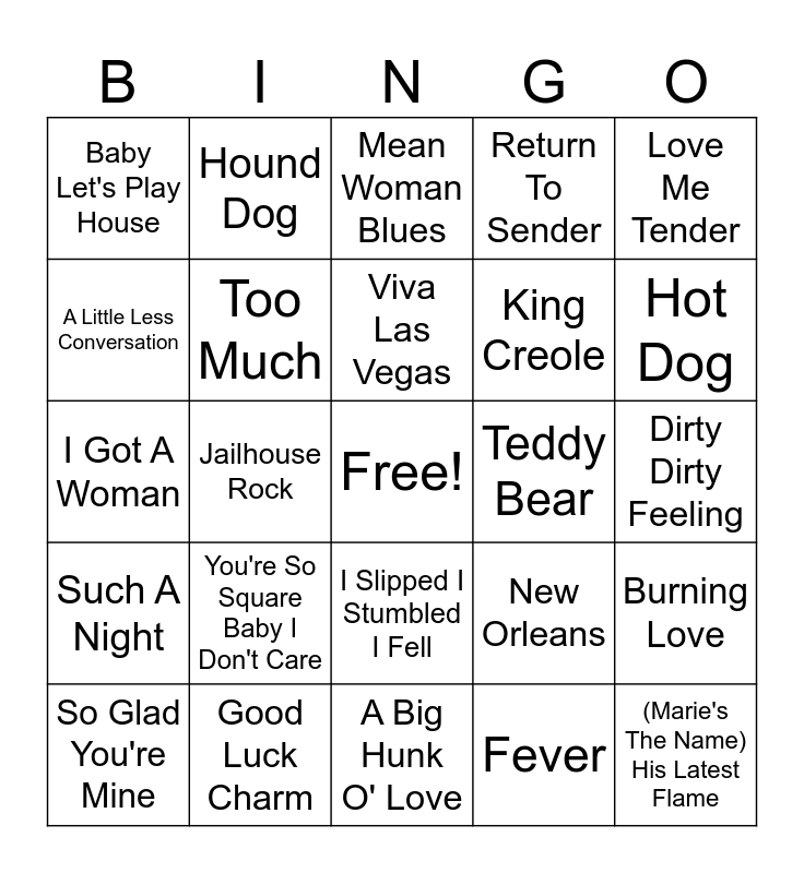 This bingo card has a free space and 53 words: Supsicious Minds, Jailhouse Rock, Don't Be Cruel, Heartbreak Hotel, Burning Love, Blue Suede Shoes, Hound Dog, You're The Devil In Disguise, Return To Sender, All Shook Up, A Little Less Conversation, Stuck On You, Fever, (Marie's The Name) His Latest Flame, Little Sister, Good Luck Charm, Viva Las Vegas, Teddy Bear, That's All Right, Baby Let's Play House, Too Much, A Big Hunk O' Love, King Creole, Love Me Tender, Treat Me Right, Rock A Hula Baby, Kentucky Rain, Didja Ever, GI Blues, I Got A Woman, Tutti Frutti, Money Honey, Rip It Up, Long Tall Sally, So Glad You're Mine, Ready Teddy, Mean Woman Blues, Got A Lot O' Livin' To Do, Hot Dog, Have I Told You Lately That I Love You, Dixieland Rock, Don't Ask Me Why, New Orleans, Poor Boy, Blue Moon Of Kentucky, You're So Square Baby I Don't Care, Wear My Ring Around Your Neck, Doncha' Think Its Time, Dirty Dirty Feeling, Such A Night, Put THe Blame On Me, I Slipped I Stumbled I Fell and TROUBLE.