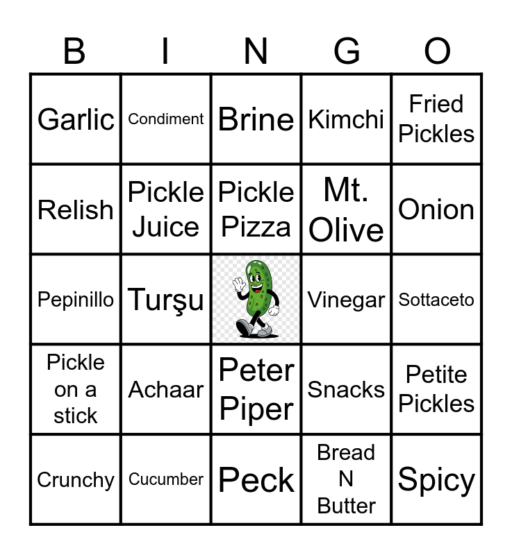 This bingo card has a free space and 59 words: Dill, Cucumber, Sour, Pickle on a stick, Bread N Butter, Kosher, Pickle Juice, Cramps, Mt. Olive, Vlasic, Kimchi, Claussen, Relish, Green, Gherkin, Garlic, Spicy, Fried Pickles, Pickle Popcorn, Pickle Pizza, Vinegar, Brine, Crunchy, Petite Pickles, Pickleball, Sweet, Cloves, Mason Jar, Onion, Ferment, Coriander, Mustard Seeds, Sweet 'n Sour, Refrigerator Pickles, Condiment, Sauerkraut, Cornishon, Turşu, Torshi, Pepinillo, Essiggurke, Achaar, Sottaceto, Pikurusu, Phak Dong, Kitunguu saumu, Qajaar dhanaan, Pickled Peppers, Peter Piper, Peck, Softball Pickle Drill, Peppercorns, Predicament, Chutney, Canning, Snacks, Sandwiches, Charcuterie Boards and Garnishes.