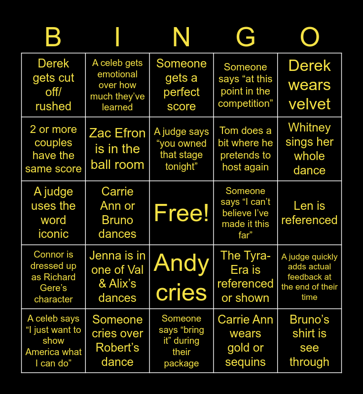 This bingo card has a free space and 30 words: Someone cries over Robert’s dance, Jordan does gymnastics, Carrie Ann or Bruno dances, Carrie Ann gets booed, Derek gets cut off/ rushed, Someone gets a perfect score, Zac Efron is in the ball room, Andy cries, Someone says “I can’t believe I’ve made it this far”, Someone says “bring it” during their package, Len is referenced, Bruno’s shirt is see through, Carrie Ann wears gold or sequins, There’s real water or water effect during “singing in the rain”, Whitney sings her whole dance, Julianne flubs her words, The Tyra-Era is referenced or shown, Connor is dressed up as Richard Gere’s character, Jenna is in one of Val & Alix’s dances, Derek wears velvet, A judge uses the word iconic, A duo gets a standing ovation from only one judge, A celeb gets emotional over how much they’ve learned, Tom does a bit where he pretends to host again, 2 or more couples have the same score, Someone says “at this point in the competition”, A judge quickly adds actual feedback at the end of their time, A celeb says “I just want to show America what I can do”, A judge says “you owned that stage tonight” and Mandy Moore choreographs a dance.