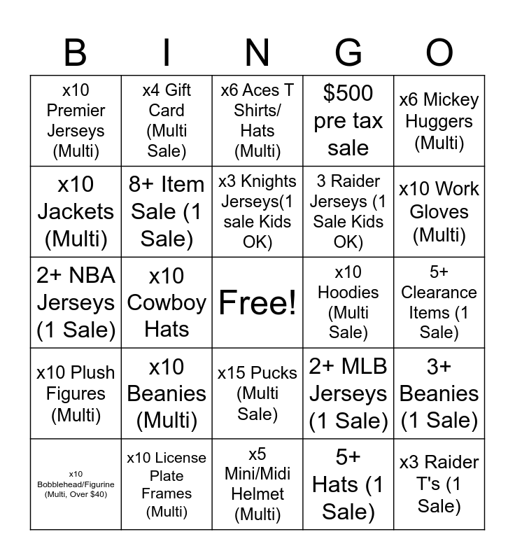 This bingo card has a free space and 24 words: x10 Beanies (Multi), x10 License Plate Frames (Multi), x3 Knights Jerseys(1 sale Kids OK), x10 Bobblehead/Figurine (Multi, Over $40), x6 Mickey Huggers (Multi), x10 Premier Jerseys (Multi), x10 Jackets (Multi), x4 Gift Card (Multi Sale), x10 Hoodies (Multi Sale), x15 Pucks (Multi Sale), 3 Raider Jerseys (1 Sale Kids OK), 2+ NBA Jerseys (1 Sale), 2+ MLB Jerseys (1 Sale), 3+ Beanies (1 Sale), 8+ Item Sale (1 Sale), 5+ Hats (1 Sale), 5+ Clearance Items (1 Sale), x6 Aces T Shirts/ Hats (Multi), x10 Work Gloves (Multi), x10 Cowboy Hats, x3 Raider T's (1 Sale), x10 Plush Figures (Multi), $500 pre tax sale and x5 Mini/Midi Helmet (Multi).