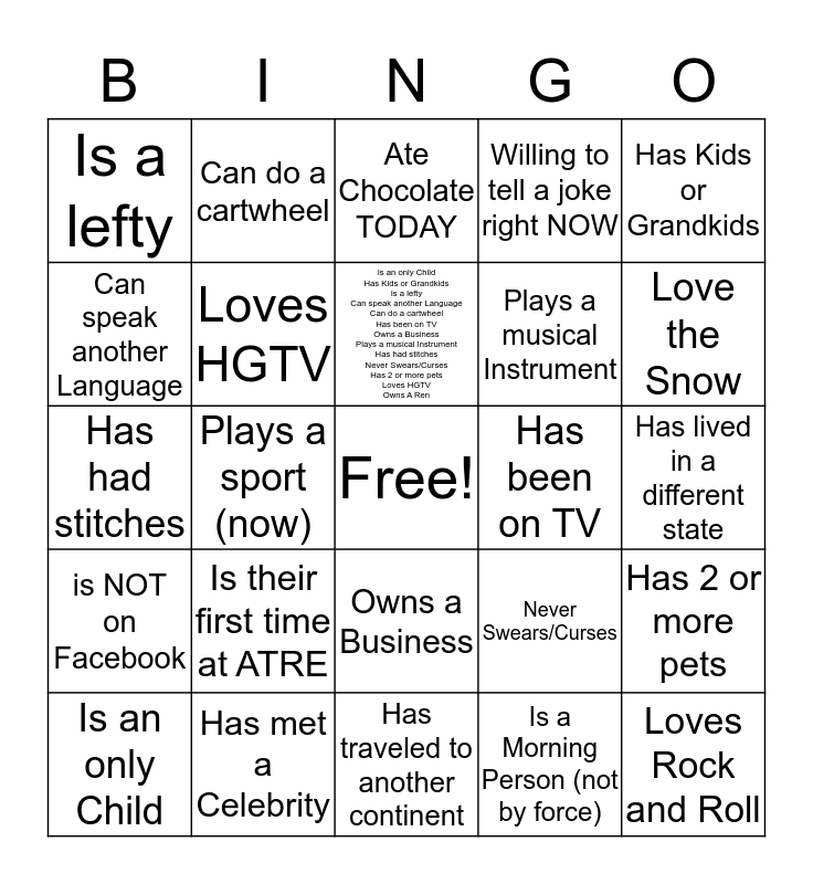 This bingo card has a free space and 25 words: Is their first time at ATRE, Has traveled to another continent, Is an only Child Has Kids or Grandkids Is a lefty Can speak another Language Can do a cartwheel Has been on TV Owns a Business Plays a musical Instrument Has had stitches Never Swears/Curses Has 2 or more pets Loves HGTV Owns A Ren, Is an only Child, Has Kids or Grandkids, Is a lefty, Can speak another Language, Can do a cartwheel, Has been on TV, Owns a Business, Plays a musical Instrument, Has had stitches, Never Swears/Curses, Has 2 or more pets, Loves HGTV, Owns A Rental Property, Has lived in a different state, Ate Chocolate TODAY, Love the Snow, Plays a sport (now), Loves Rock and Roll, Has met a Celebrity, is NOT on Facebook, Willing to tell a joke right NOW and Is a Morning Person (not by force).