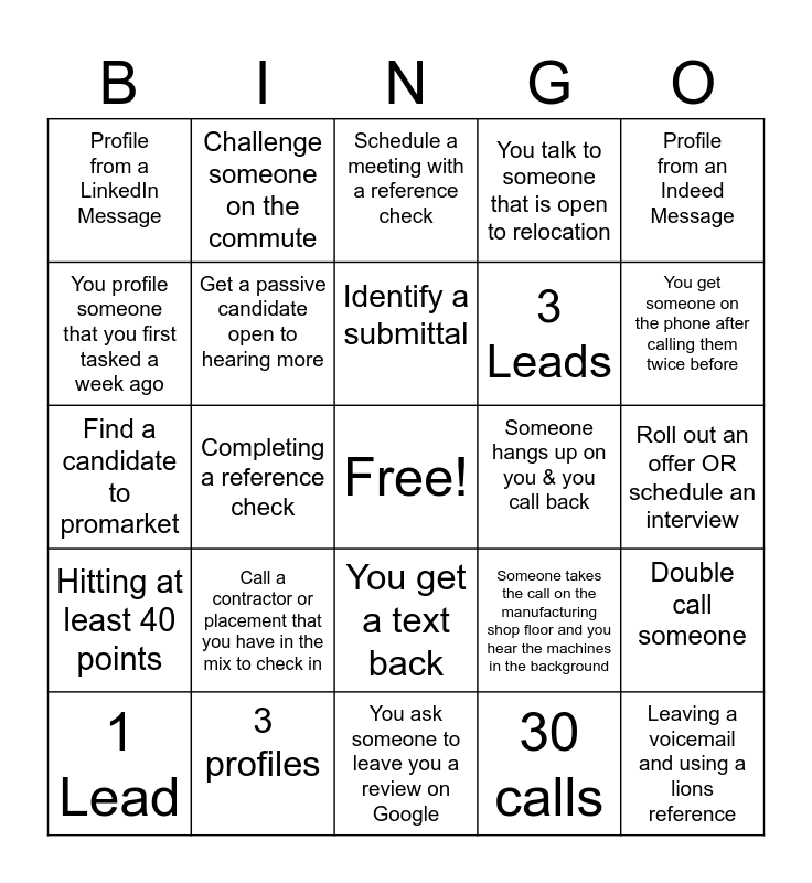 This bingo card has a free space and 29 words: Schedules a profile for later in the day, 3 profiles, Schedule a meeting with a reference check, Getting references during the profile, Profile from an Indeed Message, Profile from a LinkedIn Message, Get a passive candidate open to hearing more, Identify a submittal, Someone hangs up on you & you call back, Double call someone, 1 Lead, Completing a reference check, 30 calls, Leaving a voicemail and using a lions reference, Find a candidate to promarket, You challenge someone on the pay, You ask someone to leave you a review on Google, Someone takes the call on the manufacturing shop floor and you hear the machines in the background, You get someone on the phone after calling them twice before, Hitting at least 40 points, Call a contractor or placement that you have in the mix to check in, Contract lead on call, 3 Leads, Roll out an offer OR schedule an interview, You profile someone that you first tasked a week ago, Challenge someone on the commute, You get a text back, You talk to someone that is open to relocation and Profile lasts longer than 15 minuts.
