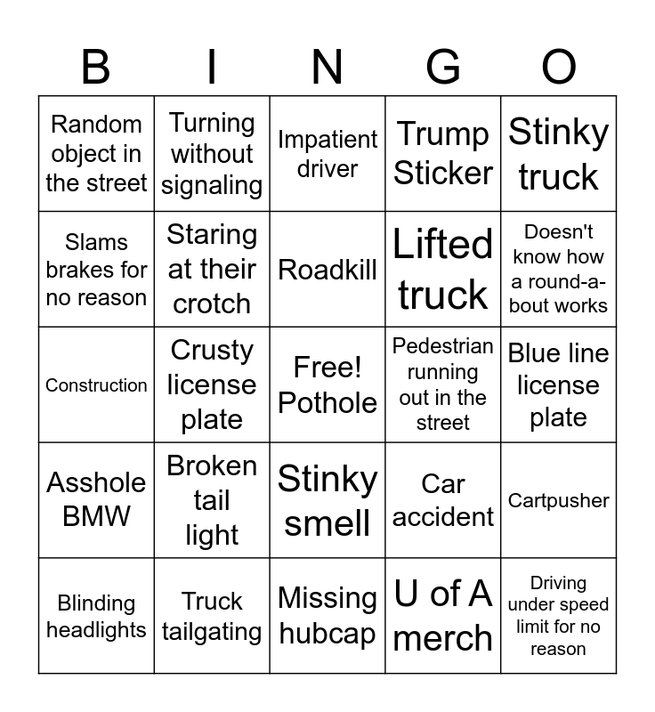 This bingo card has a free space and 27 words: Car accident, Car that looks like it was in an accident, Lifted truck, Missing hubcap, Slams brakes for no reason, Impatient driver, Turning without signaling, Asshole BMW, Pedestrian running out in the street, Cartpusher, Construction, Trump Sticker, Blinding headlights, Truck tailgating, Doesn't know how a round-a-bout works, Train at rush hour, Staring at their crotch, Roadkill, Broken tail light, Random object in the street, Blue line license plate, U of A merch, Crusty license plate, Driving under speed limit for no reason, Stinky smell, Stinky truck and Pollution haze.