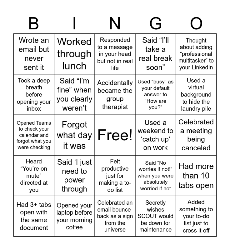 This bingo card has a free space and 29 words: Had 3+ tabs open with the same document, Said ‘After this week it’ll calm down, Forgot what day it was, Drank coffee instead of water, Wrote an email but never sent it, Responded to a message in your head but not in real life, Said “I’m fine” when you clearly weren’t, Said ‘I just need to power through, Used a weekend to ‘catch up’ on work, Opened your laptop before your morning coffee, Celebrated a meeting being canceled, Added something to your to-do list just to cross it off, Celebrated an email bounce-back as a sign from the universe, Secretly wishes SCOUT would be down for maintenance, Used a virtual background to hide the laundry pile, Wrote “per my last email” (or wanted to)more, Felt productive just for making a to-do list, Heard “You’re on mute” directed at you, Thought about adding “professional multitasker” to your LinkedIn, Opened Teams to check your calendar and forgot what you were checking, Said “No worries if not!” when you were absolutely worried if not, Opened a spreadsheet and immediately forgot why, Used “busy” as your default answer to “How are you?”, Took a deep breath before opening your inbox, Said “I’ll take a real break soon”, Worked through lunch, Had more than 10 tabs open, Accidentally became the group therapist and Promised yourself you’d go to bed early — didn’t.
