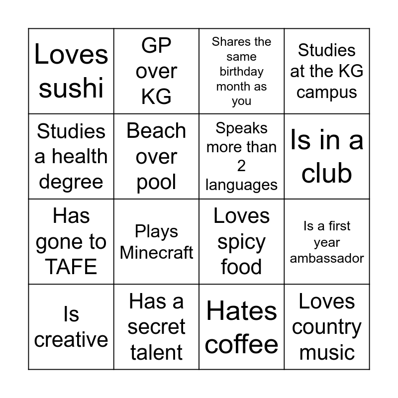 This bingo card has 32 words: Loves matcha, Is graduating this year, Is a first year ambassador, Studying a double degree, Loves country music, Speaks more than 2 languages, Studies a health degree, Lived in a different state, GP over KG, Plays an instrument, Is in a club, Shares the same birthday month as you, Is called only by their nickname, Loves taking photos, Has a secret talent, Has met a famous person, Has travelled abroad, Loves spicy food, Studies law, Has more than one job, Lives on the northside, Plays sport competitively, Hates coffee, Loves the colour green, Is creative, Studies at the KG campus, Has gone to TAFE, Beach over pool, Loves sushi, NSW over QLD, Studies education and Plays Minecraft.