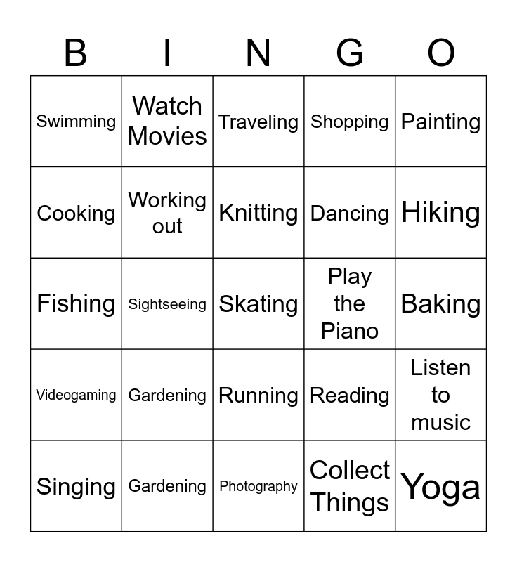 This bingo card has 25 words: Gardening, Photography, Knitting, Singing, Painting, Swimming, Cooking, Watch Movies, Play the Piano, Running, Dancing, Fishing, Reading, Listen to music, Working out, Yoga, Baking, Traveling, Hiking, Sightseeing, Skating, Gardening, Videogaming, Shopping and Collect Things.