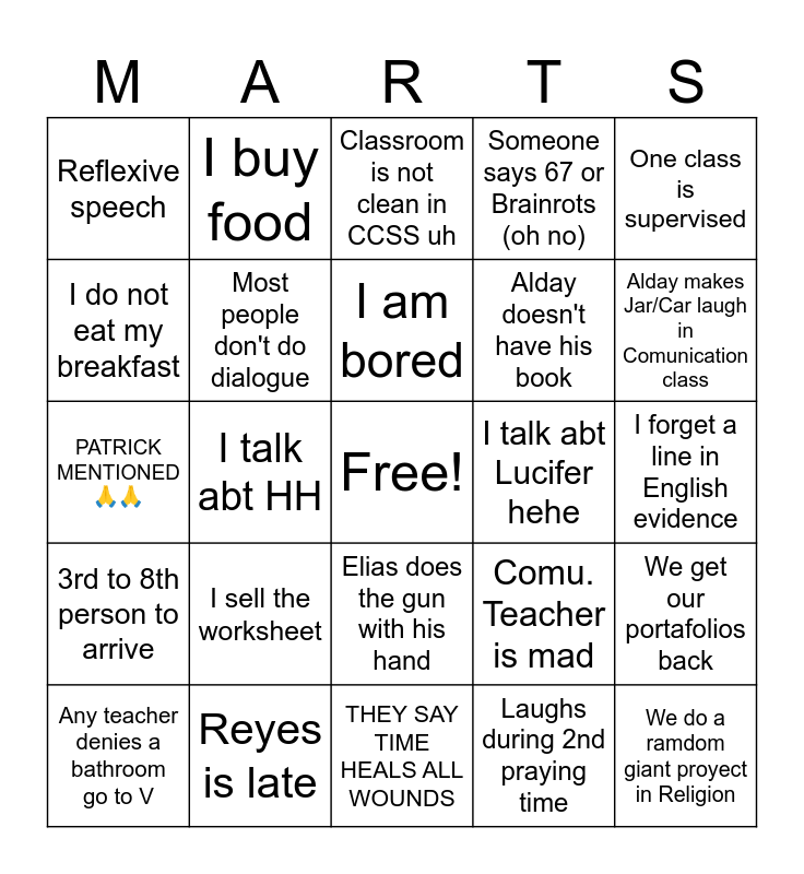 This bingo card has 1 images, a free space and 29 words: Reyes is late, Someone buys Takis, I talk abt HH, Reflexive speech, Classroom is not clean in CCSS uh, Most people don't do dialogue, Elias does the gun with his hand, I talk abt Lucifer hehe, THEY SAY TIME HEALS ALL WOUNDS, I forget a line in English evidence, We do a ramdom giant proyect in Religion, Laughs during 2nd praying time, I feel tired, Alday makes Jar/Car laugh in Comunication class, I get a Bingo, Comu. Teacher is mad, 3rd to 8th person to arrive, I sell the worksheet, One class is supervised, PATRICK MENTIONED 🙏🙏, Romina and Polo don't buy my food, I buy food, Alday doesn't have his book, I do not eat my breakfast, Someone says 67 or Brainrots (oh no), We get our portafolios back, Any teacher denies a bathroom go to V, I am bored and I forget where are we.