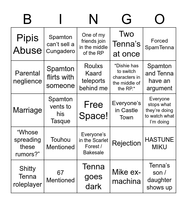 This bingo card has a free space and 24 words: Touhou Mentioned, 67 Mentioned, Roulxs Kaard teleports behind me, Shitty Tenna roleplayer, Forced SpamTenna, Pipis Abuse, Parental neglience, Spamton can’t sell a Cungadero, Everyone’s in Castle Town, Everyone’s in the Scarlet Forest / Bakesale, *Dishie has to switch characters in the middle of the RP.*, Marriage, Rejection, HASTUNE MIKU, Spamton flirts with someone, Mike ex-machina, Everyone stops what they’re doing to watch what I’m doing, One of my friends join in the middle of the RP, Spamton and Tenna have an argument, Spamton vents to his Tasque, Tenna’s son / daughter shows up, “Whose spreading these rumors?”, Two Tenna’s at once and Tenna goes dark.