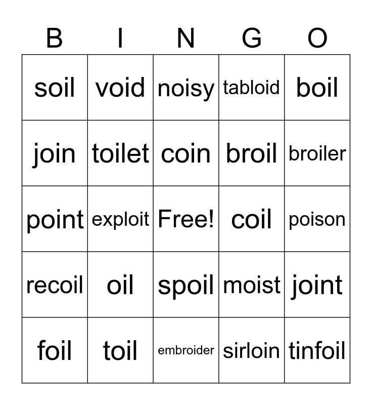 This bingo card has a free space and 24 words: oil, toil, coin, foil, boil, soil, join, void, coil, spoil, broil, point, moist, joint, toilet, sirloin, poison, noisy, broiler, exploit, tinfoil, recoil, tabloid and embroider.