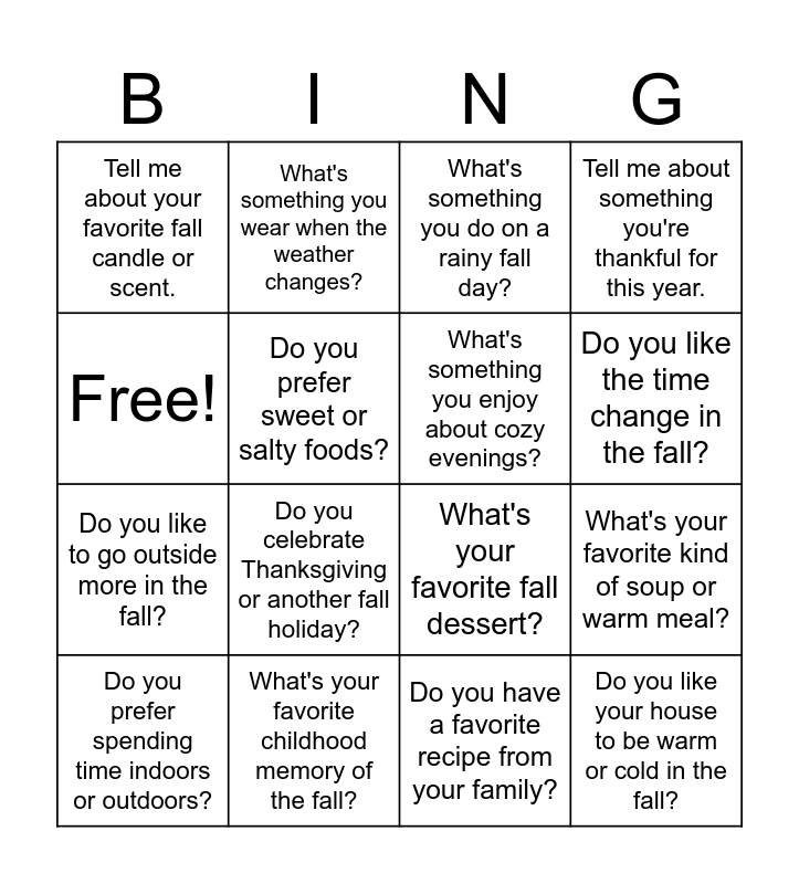 This bingo card has 16 words: What's your favorite childhood memory of the fall?, What's your favorite kind of soup or warm meal?, What's something you do on a rainy fall day?, Tell me about your favorite fall candle or scent., Do you like to go outside more in the fall?, What's something you wear when the weather changes?, What's your favorite fall dessert?, Do you have a favorite recipe from your family?, Free!, Do you prefer sweet or salty foods?, Do you prefer spending time indoors or outdoors?, Tell me about something you're thankful for this year., Do you celebrate Thanksgiving or another fall holiday?, Do you like the time change in the fall?, What's something you enjoy about cozy evenings? and Do you like your house to be warm or cold in the fall?.