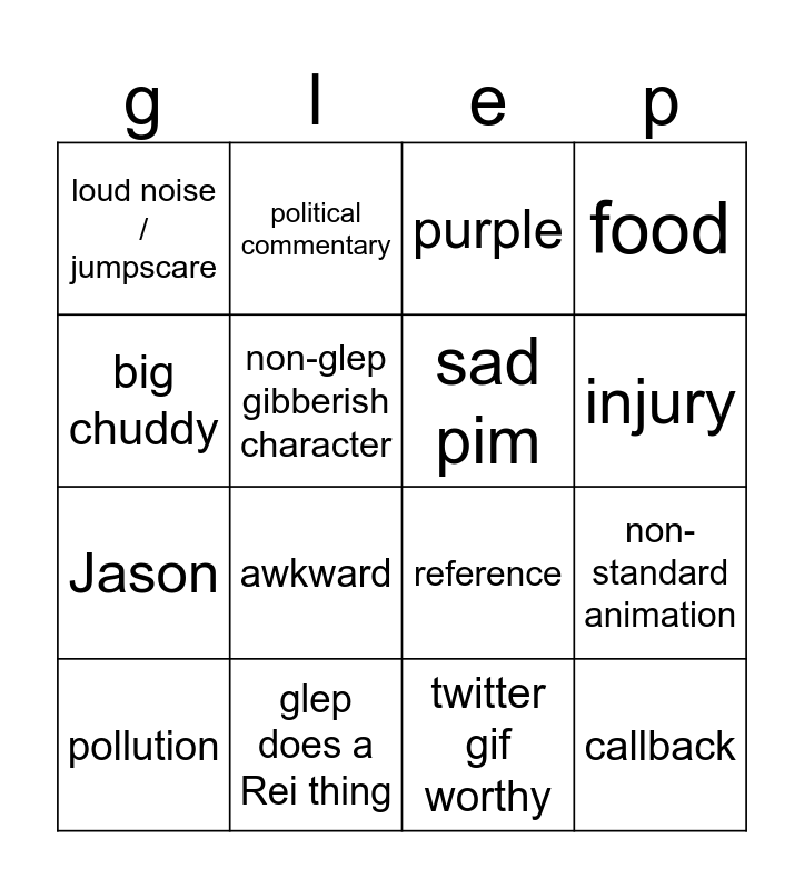 This bingo card has 16 words: glep does a Rei thing, non-standard animation, purple, loud noise / jumpscare, Jason, political commentary, reference, twitter gif worthy, big chuddy, non-glep gibberish character, pollution, food, awkward, injury, sad pim and callback.