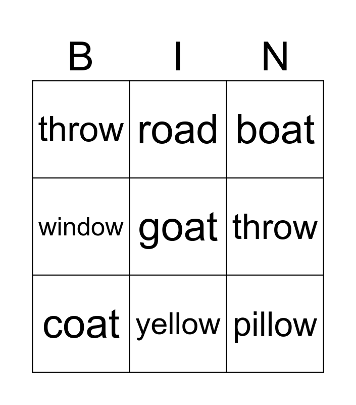 This bingo card has a free space and 8 words: throw, boat, road, coat, throw, pillow, window and yellow.