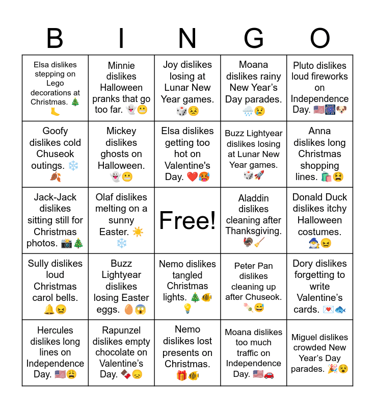 This bingo card has a free space and 42 words: Mickey dislikes fireworks on New Year's Eve. ๐๐ซ, Elsa dislikes getting too hot on Valentine's Day. โค๏ธ๐ฅต, Woody dislikes cleaning after Thanksgiving dinner. ๐ฆ๐ฉ, Buzz Lightyear dislikes losing Easter eggs. ๐ฅ๐ฑ, Moana dislikes too much traffic on Independence Day. ๐บ๐ธ๐, Dory dislikes forgetting to write Valentineโs cards. ๐๐, Miguel dislikes crowded New Yearโs Day parades. ๐๐ต, Sully dislikes stepping on candy on Halloween. ๐ฌ๐ฌ, Joy dislikes losing at Lunar New Year games. ๐ฒ๐ฃ, Nemo dislikes tangled Christmas lights. ๐๐ ๐ก, Donald Duck dislikes itchy Halloween costumes. ๐งโโ๏ธ๐, Anna dislikes long Christmas shopping lines. ๐๏ธ๐ซ, Olaf dislikes melting on a sunny Easter. โ๏ธโ๏ธ, Pluto dislikes loud fireworks on Independence Day. ๐บ๐ธ๐๐ถ, Violet dislikes scary Halloween decorations. ๐ธ๏ธ๐ป, Peter Pan dislikes cleaning up after Chuseok. ๐ก๐ , Rapunzel dislikes cutting Halloween pumpkins. ๐๐ช, Jack-Jack dislikes sitting still for Christmas photos. ๐ธ๐, Merida dislikes waiting for Lunar New Year fireworks. ๐ฎ๐ค, Minnie dislikes Halloween pranks that go too far. ๐ป๐ฌ, Goofy dislikes cold Chuseok outings. โ๏ธ๐, Simba dislikes loud New Yearโs Eve celebrations. ๐๐ฆ, Wall-E dislikes messy Christmas wrapping paper. ๐๐ค, Elsa dislikes stepping on Lego decorations at Christmas. ๐๐ฆถ, Joy dislikes getting scared in haunted houses. ๐๏ธ๐ฑ, Miguel dislikes missing Chuseok treats. ๐ก๐, Buzz Lightyear dislikes losing at Lunar New Year games. ๐ฒ๐, Dory dislikes long waits for Halloween treats. ๐ฌ๐, Donald Duck dislikes sticky Halloween decorations. ๐ธ๏ธ๐ค, Anna dislikes cold winds on Halloween night. ๐ฌ๏ธ๐, Moana dislikes burnt Christmas cookies. ๐ช๐ , Sully dislikes loud Christmas carol bells. ๐๐, Mickey dislikes ghosts on Halloween. ๐ป๐ฌ, Nemo dislikes lost presents on Christmas. ๐๐ , Tiana dislikes crowded Easter egg hunts. ๐ฅ๐, Hercules dislikes long lines on Independence Day. ๐บ๐ธ๐ฉ, Rapunzel dislikes empty chocolate on Valentineโs Day. ๐ซ๐, Aladdin dislikes cleaning after Thanksgiving. ๐ฆ๐งน, Stitch dislikes fireworks on Liberation Day. ๐๐ฐ๐ท๐ต, Belle dislikes burnt Thanksgiving turkey. ๐ฆ๐ฅ, Moana dislikes rainy New Yearโs Day parades. ๐ง๏ธ๐ข and Jack Skellington dislikes summer heat on Independence Day. โ๏ธ๐.