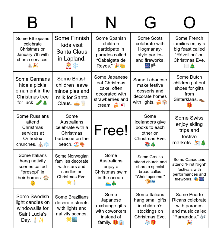 This bingo card has a free space and 33 words: Some Americans decorate big Christmas trees and exchange presents. ๐๐, Some Canadians hang stockings by the fireplace. ๐งฆ๐ฅ, Some Australians celebrate with a Christmas barbecue on the beach. ๐๏ธ๐, Some Germans set up Christmas markets and drink mulled wine. ๐๐ท, Some Italians hang nativity scenes called โpresepiโ in their homes. ๐ ๐ถ, Some British children leave mince pies and milk for Santa Claus. ๐ฅง๐ฅ, Some French families enjoy a big feast called โRรฉveillonโ on Christmas Eve. ๐ฝ๏ธ๐, Some Swedish light candles on windowsills for Saint Luciaโs Day. ๐ฏ๏ธโจ, Some Finnish kids visit Santa Claus in Lapland. ๐ โ๏ธ, Some Mexicans celebrate with โposadas,โ reenacting Mary and Josephโs journey. ๐ ๐ฏ๏ธ, Some Japanese eat Christmas cake, often decorated with strawberries and cream. ๐ฐ๐ฏ๐ต, Some Spanish children participate in parades called โCabalgata de Reyes.โ ๐๐, Some Irish families hang holly and mistletoe in their homes. ๐ฟ๐, Some Polish people share an โopลatekโ wafer before dinner. ๐โจ, Some Icelanders give books to each other on Christmas Eve. ๐๐, Some Dutch children put out shoes for gifts from Sinterklaas. ๐๐, Some Brazilians decorate streets with lights and nativity scenes. ๐๐๏ธ, Some Russians attend Christmas services at Orthodox churches. โชโ๏ธ, Some Norwegian families decorate with stars and candles on Christmas Eve. โญ๐ฏ๏ธ, Some Greeks attend church and share a special bread called โChristopsomo.โ ๐๐ฌ๐ท, Some Australians enjoy a Christmas swim in the ocean. ๐โโ๏ธ๐, Some Filipino families hold โSimbang Gabi,โ a series of early morning masses. โช๐ , Some Ethiopians celebrate Christmas on January 7th with church services. โช๐, Some Swiss enjoy skiing trips and festive markets. โท๏ธ๐, Some Japanese exchange gifts with coworkers instead of family. ๐๐, Some Puerto Ricans celebrate with parades and music called โParrandas.โ ๐ถ๐, Some Scots celebrate with Hogmanay-style parties and fireworks. ๐๐ด, Some Lebanese make festive desserts and decorate homes with lights. ๐ฐ๐ , Some Germans hide a pickle ornament in the Christmas tree for luck. ๐ฅ๐, Some Canadians attend โFirst Nightโ festivals with performances and fireworks. ๐ญ๐, Some Americans watch Christmas movies together as a family tradition. ๐บ๐, Some Italians hang small gifts in childrenโs stockings on Christmas Eve. ๐งฆ๐ and Some Icelanders read books and enjoy quiet evenings with family. ๐โ๏ธ.