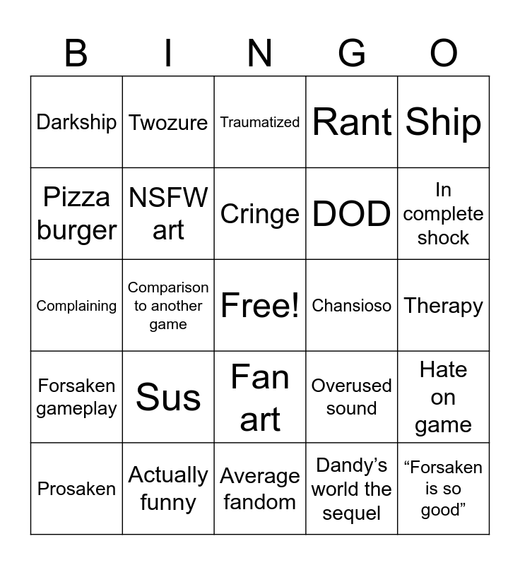 This bingo card has a free space and 24 words: Sus, Actually funny, Cringe, Prosaken, Ship, Darkship, Pizza burger, Twozure, Chansioso, Fan art, DOD, Complaining, Overused sound, Hate on game, NSFW art, Dandy’s world the sequel, Therapy, Traumatized, In complete shock, Comparison to another game, “Forsaken is so good”, Forsaken gameplay, Rant and Average fandom.