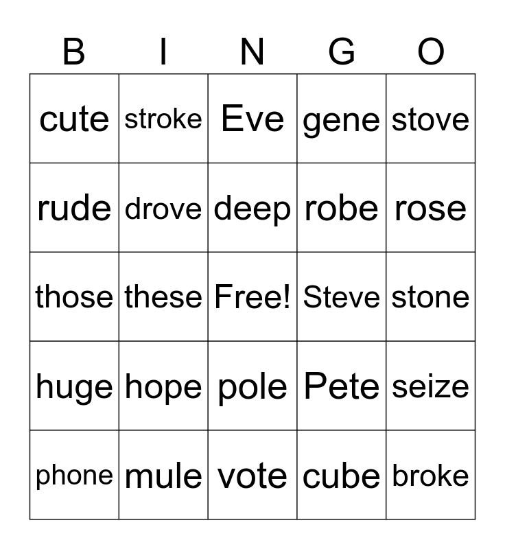 This bingo card has a free space and 29 words: phone, use, these, bone, cute, Eve, drove, hope, Steve, mule, stone, broke, vote, cube, rose, home, pole, huge, stove, those, Pete, rope, robe, rude, gene, stroke, seize, deep and feet.