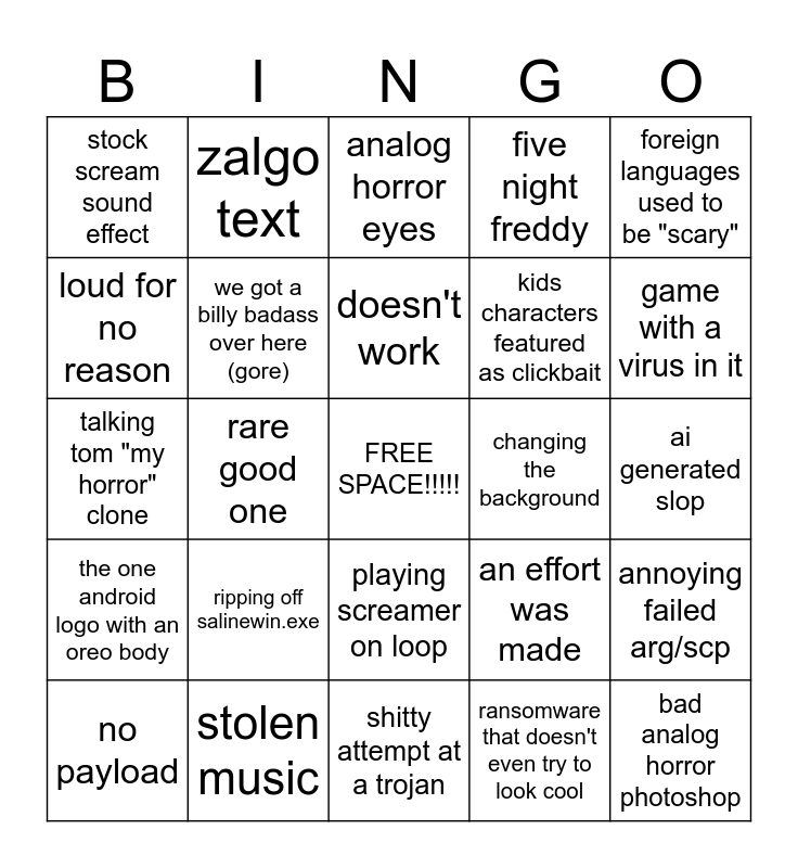 This bingo card has a free space and 24 words: ripping off salinewin.exe, stolen music, doesn't work, no payload, foreign languages used to be "scary", stock scream sound effect, loud for no reason, zalgo text, changing the background, playing screamer on loop, kids characters featured as clickbait, talking tom "my horror" clone, an effort was made, annoying failed arg/scp, we got a billy badass over here (gore), ransomware that doesn't even try to look cool, ai generated slop, analog horror eyes, game with a virus in it, rare good one, bad analog horror photoshop, the one android logo with an oreo body, five night freddy and shitty attempt at a trojan.