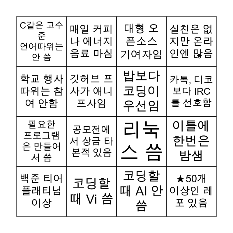 This bingo card has 16 words: 코딩할 때 Vi 씀, 이틀에 한번은 밤샘, 대형 오픈소스 기여자임, C같은 고수준 언어따위는 안 씀, 필요한 프로그램은 만들어서 씀, 매일 커피나 에너지음료 마심, 리눅스 씀, 코딩할때 AI 안 씀, 학교 행사따위는 참여 안함, 깃허브 프사가 애니프사임, 백준 티어 플래티넘 이상, 실친은 없지만 온라인엔 많음, 공모전에서 상금 타본적 있음, 카톡, 디코보다 IRC를 선호함, 밥보다 코딩이 우선임 and ★50개 이상인 레포 있음.