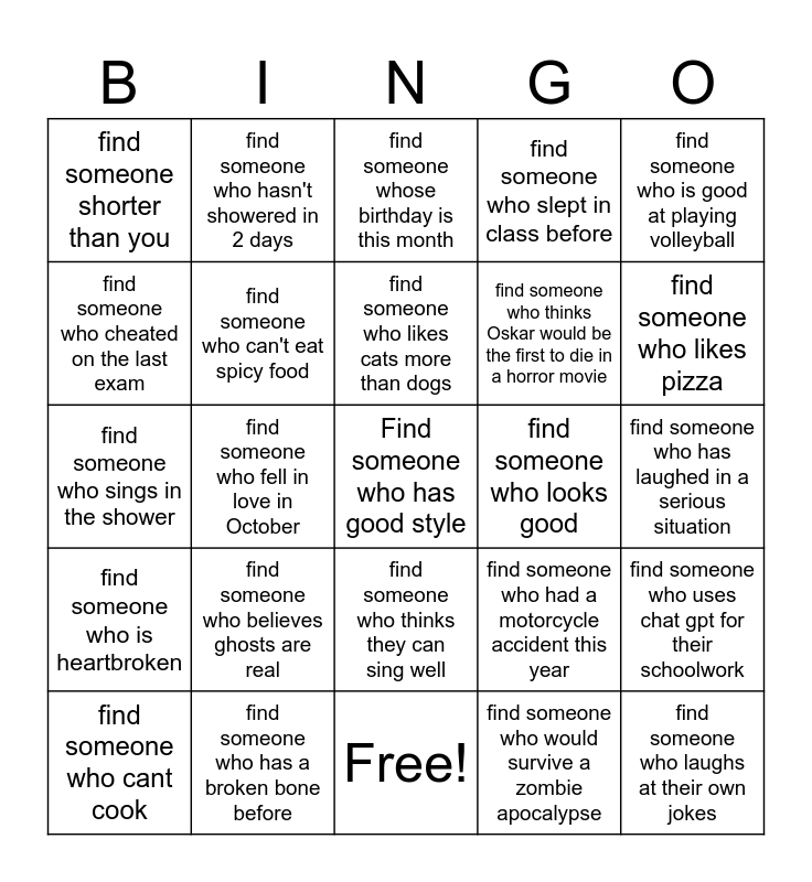 This bingo card has 25 words: find someone who is heartbroken, find someone who has a broken bone before, Find someone who has good style, find someone who would survive a zombie apocalypse, find someone who is good at playing volleyball, find someone shorter than you, find someone who hasn't showered in 2 days, find someone whose birthday is this month, find someone who looks good, find someone who uses chat gpt for their schoolwork, find someone who cheated on the last exam, find someone who can't eat spicy food, Free!, find someone who had a motorcycle accident this year, find someone who likes pizza, find someone who cant cook, find someone who fell in love in October, find someone who likes cats more than dogs, find someone who thinks Oskar would be the first to die in a horror movie, find someone who has laughed in a serious situation, find someone who sings in the shower, find someone who believes ghosts are real, find someone who thinks they can sing well, find someone who slept in class before and find someone who laughs at their own jokes.