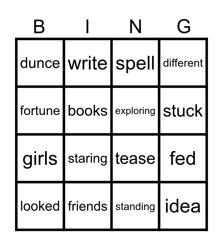 This bingo card has 27 words: tomorrow, school, girls, read, books, spell, write, idea, friends, laugh, tease, different, teachers, bad, staring, dreaming, exploring, stuck, classroom, dunce, standing, corner, fed, looked, longer, fortune and proud.