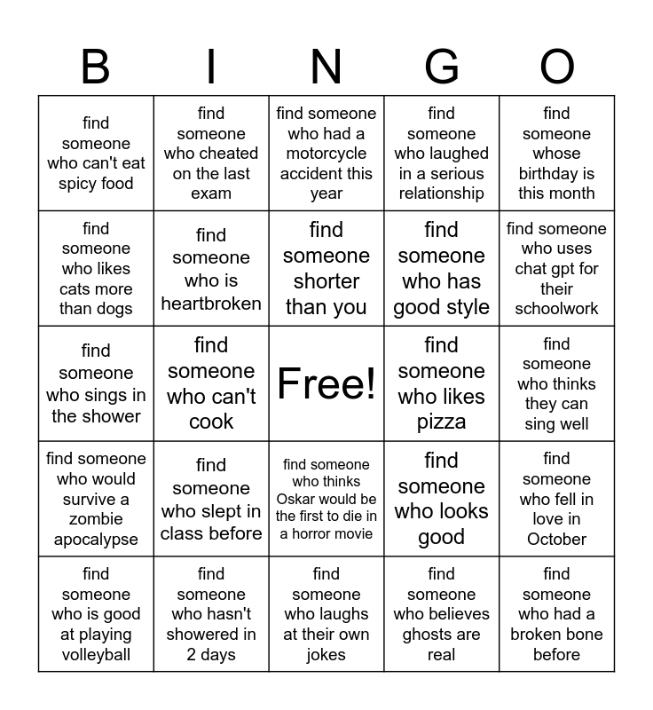 This bingo card has a free space and 24 words: find someone who slept in class before, find someone who hasn't showered in 2 days, find someone shorter than you, find someone who is good at playing volleyball, find someone whose birthday is this month, find someone who can't eat spicy food, find someone who likes cats more than dogs, find someone who cheated on the last exam, find someone who likes pizza, find someone who thinks Oskar would be the first to die in a horror movie, find someone who has good style, find someone who sings in the shower, find someone who looks good, find someone who fell in love in October, find someone who is heartbroken, find someone who believes ghosts are real, find someone who thinks they can sing well, find someone who had a motorcycle accident this year, find someone who uses chat gpt for their schoolwork, find someone who can't cook, find someone who had a broken bone before, find someone who would survive a zombie apocalypse, find someone who laughed in a serious relationship and find someone who laughs at their own jokes.